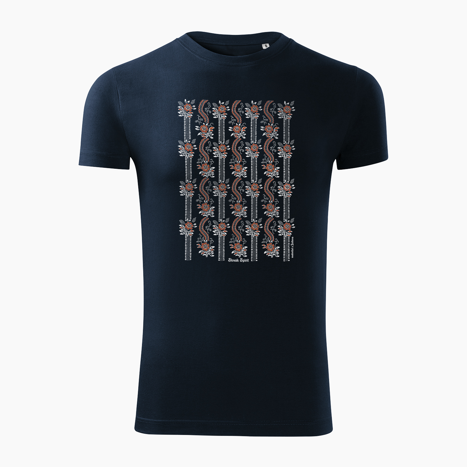 Tmavomodré tričko s kvalitnou potlačou v kontrastných farbách – biela, červená a hrdzavo-oranžová. Vyzerá tradične, no zároveň štýlovo a sviežo. Strih je pohodlný, materiál príjemný na nosenie. Navrhnuté na Slovensku – pre všetkých, čo majú radi slovenský duch, vzory a poctivú prácu.
