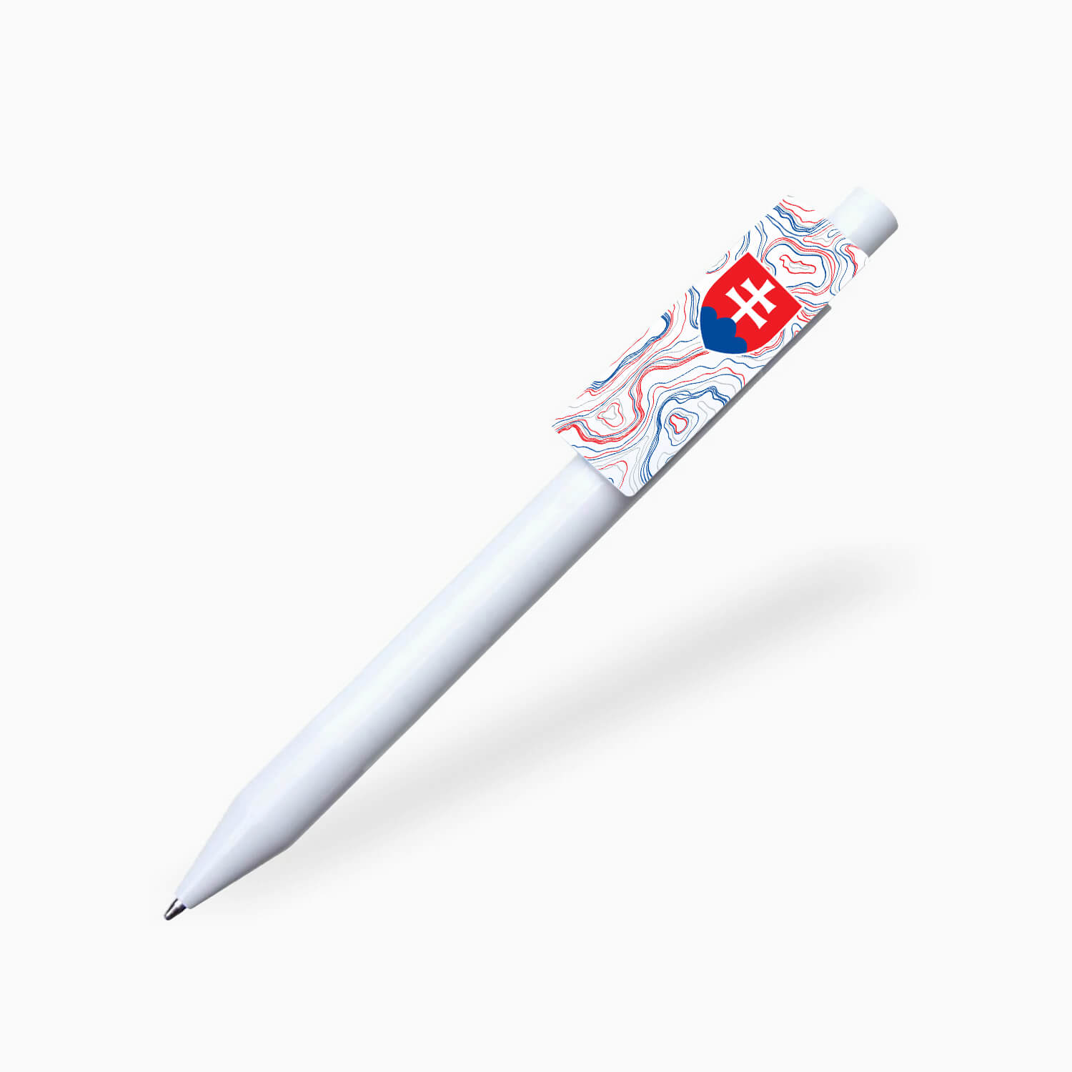 Guľôčkové pero pre všetkých, čo majú radi Slovensko – biele pero s modrou náplňou, potlač Slovenský znak a farby našej trikolóry.